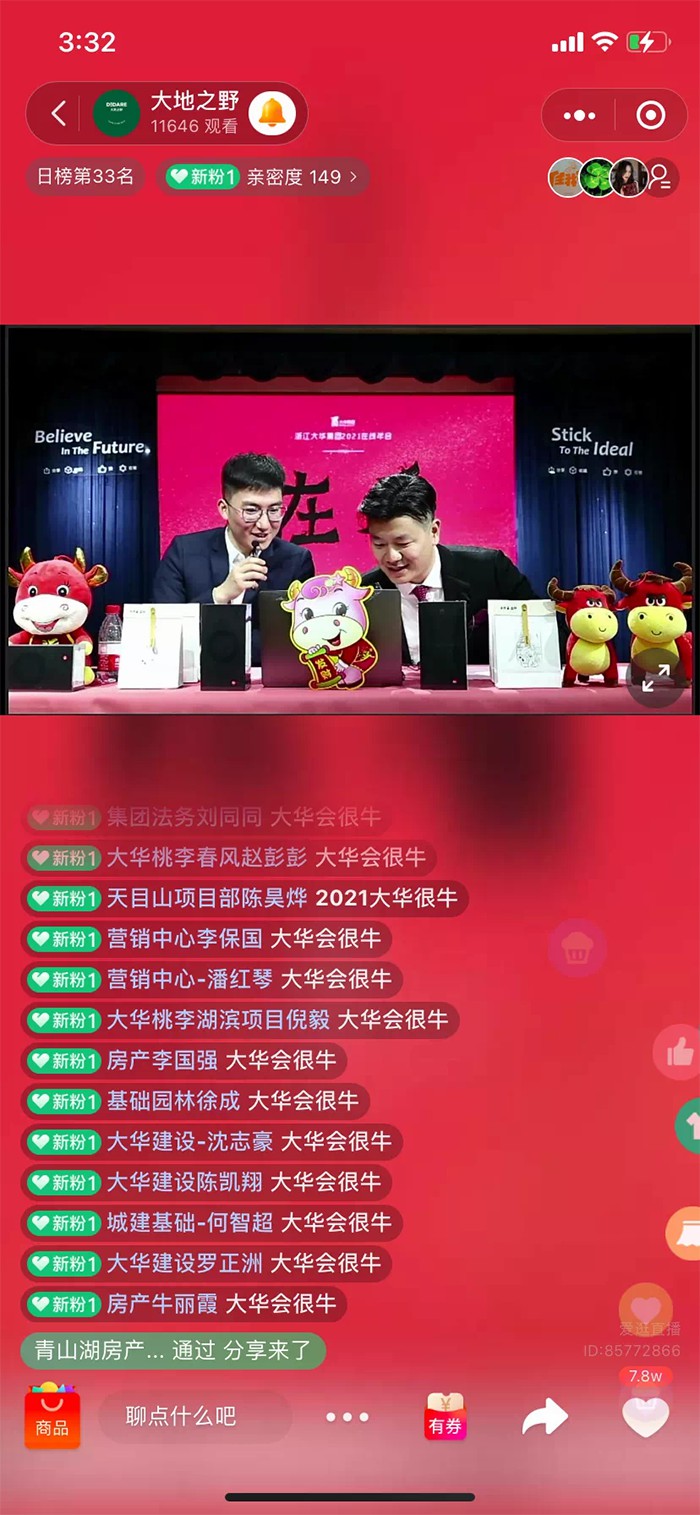 下午,集团总裁陈鱼海先生带领着高管团队,齐聚直播现场,不仅通过直播送来了祝福,更是个个穿插“上阵”,为线上年会送来了一波又一波的惊喜好礼。作为大华人自己策划,自己搭设备,自己当主播的年会直播首秀,可谓是赚足了人气,刷屏根本停不下来,在一串串“大华牛牛牛”“2021大华在看”等口令的背后,奖品如京东购物卡、智能动手表、吸尘器、电饭煲、森林手工盲盒、养生壶等也纷纷砸了下来,就连总裁也被“好礼”砸中。